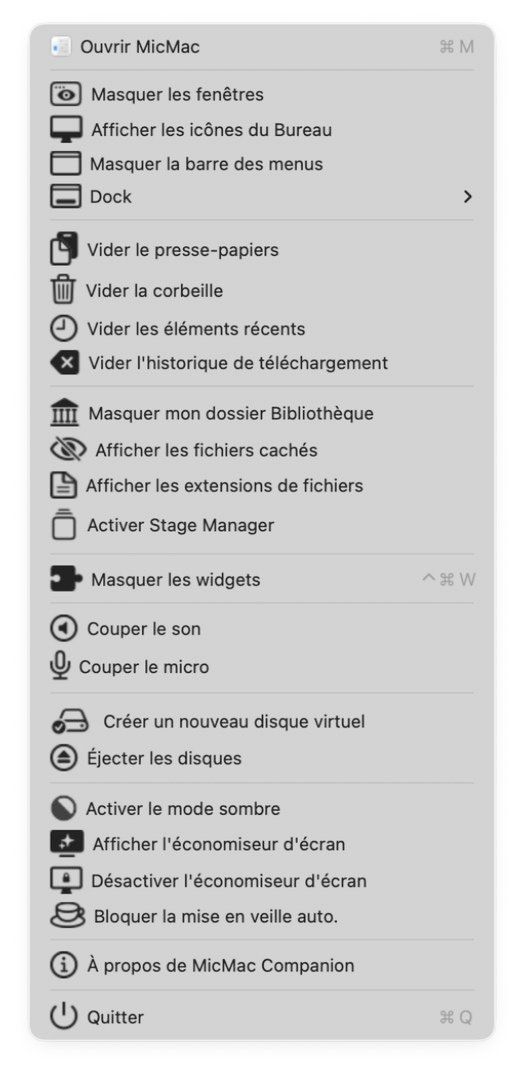 Cette application, intégrée à la barre de menus, représente un complément essentiel à MicMac, conçue dans le but de rationaliser votre expérience utilisateur en vous fournissant un accès rapide aux principales fonctionnalités de macOS, tout en intégrant des capacités visant à renforcer votre confidentialité.