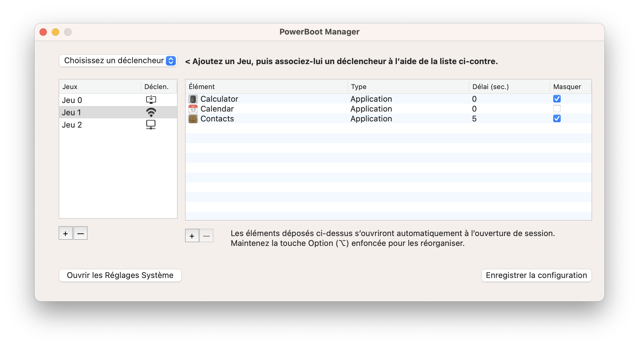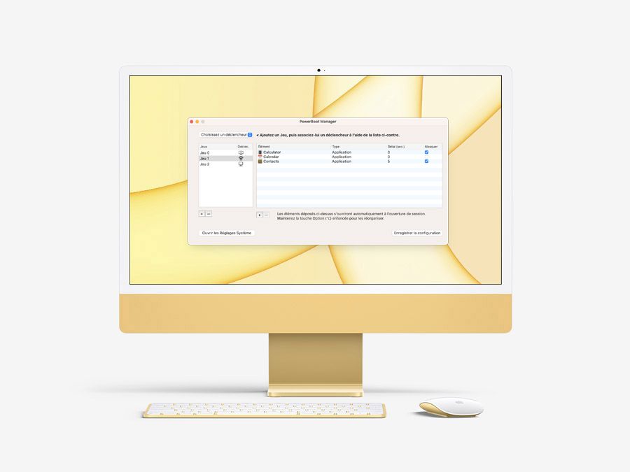 PowerBoot révolutionne le démarrage de votre Mac avec une expérience parfaitement adaptée à votre environnement. Grâce à ses déclencheurs intelligents — type de connexion (Wi-Fi ou Ethernet), source d’alimentation (batterie ou secteur), localisation géographique — vous décidez quoi lancer, quand et comment : applications, scripts Shell ou AppleScripts.