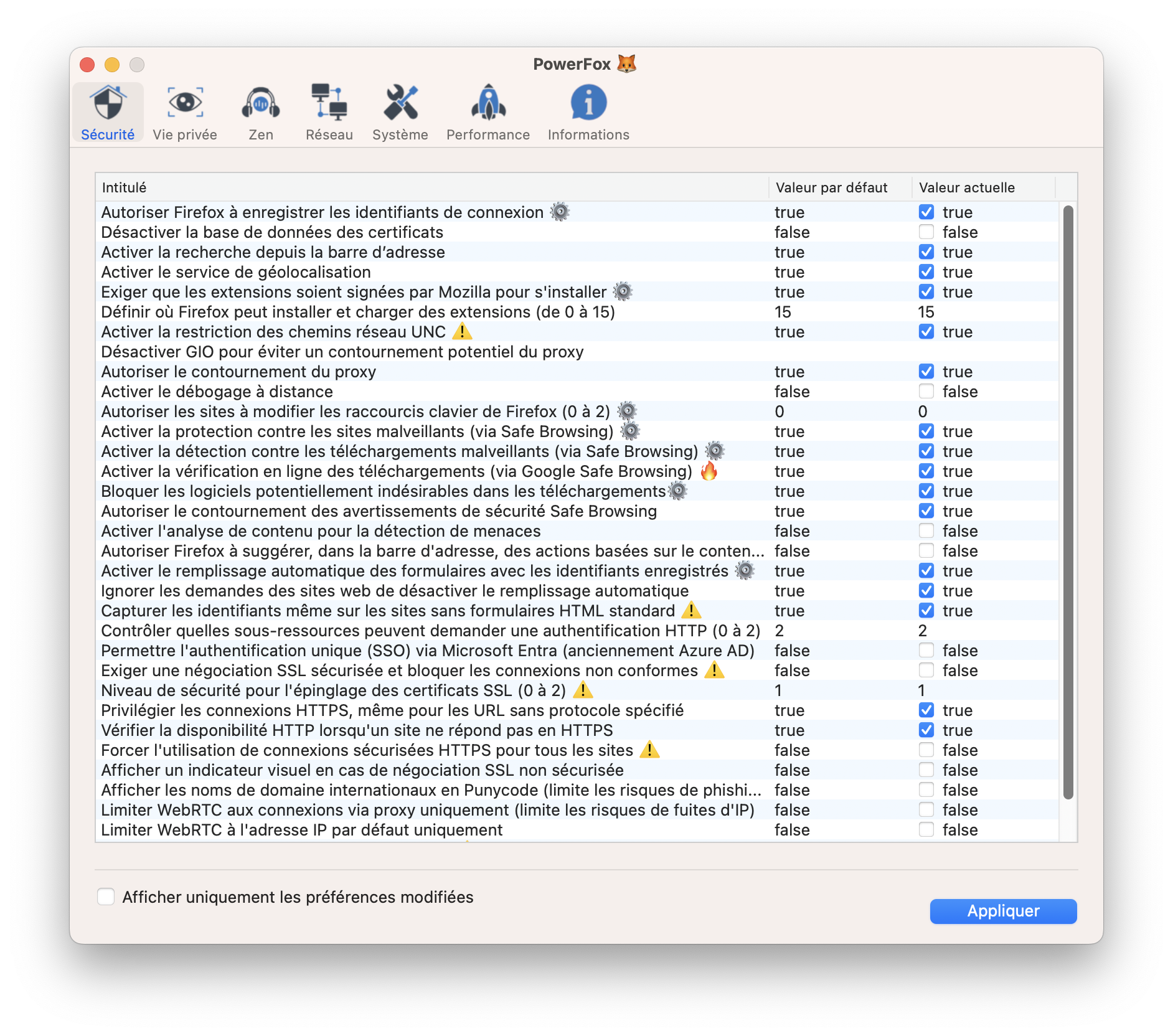 PowerFox est un utilitaire macOS qui simplifie la personnalisation avancée de Firefox. Il rend accessibles et compréhensibles des dizaines de préférences souvent obscures via une interface claire et bien organisée. Les réglages sont classés par thématiques (sécurité, vie privée, performance, etc.), avec des explications précises pour chaque option. L’application inclut aussi des outils de filtrage, de recherche et de dépannage.